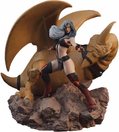 Diese hochdetaillierte PVC-Statue zeigt Taarna mit ihrem taarakianischen Reittier, das ca. 12 Zoll groß ist und auf einer bergigen Terrainbasis steht.