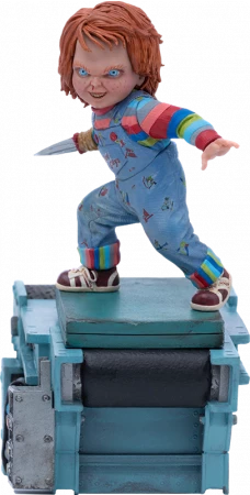 Die unverwechselbare rothaarige Puppe mit den bunten Kleidern steht auf dem Laufband einer der Maschinen in der Spielzeugfabrik namens Play Pals, wo sein Plastikkörper hergestellt wurde, genau wie im zweiten Film seines langen Weges in den Kinos. Die Puppe erscheint mit einem tödlichen Messer in einer ihrer Fäuste, einem sadistischen Lächeln im Gesicht und großen blauen Augen, die auf ihr nächstes Opfer gerichtet sind. Die Statue “Child’s Play II Chucky – Art Scale 1:10 – Child’s Play II – Iron Studios” erweitert die Horrorreihe der Iron Studios um eine weitere Kino-Ikone.