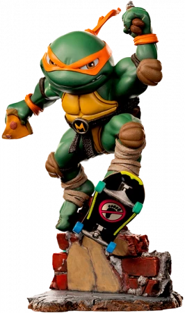 Mit einem Stück Pizza, seiner Lieblingsspeise, in der einen und einem seiner Nunchakus in der anderen Hand, springt er mit seinem Skateboard durch eine Mauer aus Ziegelsteinen auf dem Sockel. So präsentieren Iron Studios die Statue “Michelangelo – TMNT – MiniCo”, die das fröhlichste und verspielteste Mitglied der Ninja Turtles darstellt. Der treue und liebevolle Mike oder Mikey, wie er von seinen Brüdern genannt wird, ist der Jüngste der Gruppe und bekannt für seinen Optimismus, seine Witze und seine Vorliebe für Skateboarding und Pizza. Er trägt eine orangefarbene Maske und sein Name stammt von dem italienischen Architekten und Dichter Michelangelo Buonarroti.
