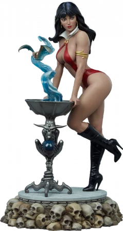 Die Vampirella-Statue im Maßstab 1:3 ist 26,5″ hoch und 15″ breit. Die vampirische Füchsin ruht an einem gruseligen Kessel, der von einem Haufen Schädel umgeben ist. Blauer Rauch wirbelt in dem dämonischen Gefäß, und eine kreischende Fledermaus erhebt sich aus den Nebeln. Jedermanns Lieblingsblutsaugerin fühlt sich inmitten der schaurigen Elemente dieser Statue wohl und gibt eine herrlich makabre Szene ab.