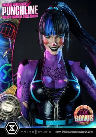 Punchline hat ein verspieltes Aussehen, aber lassen Sie sich davon nicht täuschen. Sie ist sowohl gefährlich als auch entschlossen. Und die Bildhauer von The Studio haben dafür gesorgt, dass diese Blicke in ihrem schönen Gesicht eingefangen wurden. Unsere geschickten Maler sind auch Jorges inspirierter Farbwahl gefolgt und haben sie auf Punchlines Kopf, Gesicht und Kleidung aufgetragen. Ihr blauer Haarschopf und ihre lila Strähne bilden einen perfekten Kontrast zum Rest ihres Kopfes. Ihr eng anliegendes lila Oberteil bildet einen hellen Hintergrund zu ihrem glatten und glänzenden Kleid. Jorge wollte Punchline als eine Kraft zeigen, mit der man rechnen muss, daher ist sie mit zwei Messern posiert, als ob sie bereit wäre, die nächste Person zu schneiden, die schlecht über den Joker spricht.