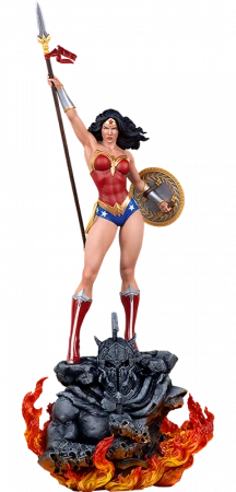 In ihrem klassischen rot-gold-weiß-blauen Trikot steht Wonder Woman in kniehohen Stiefeln auf einem verfallenen Denkmal des Kriegsgottes Ares. Dieser düstere Schrein und die Flammen, die Dianas Sockel umgeben, bilden einen starken Kontrast zu ihrem strahlenden, heldenhaften Aussehen.