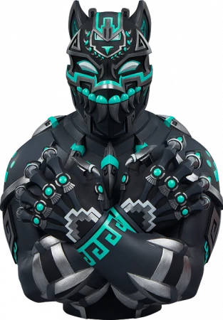 Die Stärke zweier Kriegerkulturen vereint sich in der Black Panther Designer Vinyl Collectible Bust des Künstlers Jesse Hernandez, die auf Schwarzlicht reagiert. T’Challa zeigt seine Krallen in einem wakandanischen Gruß und trägt seinen charakteristischen Vibranium-Anzug mit aztekischem Design.